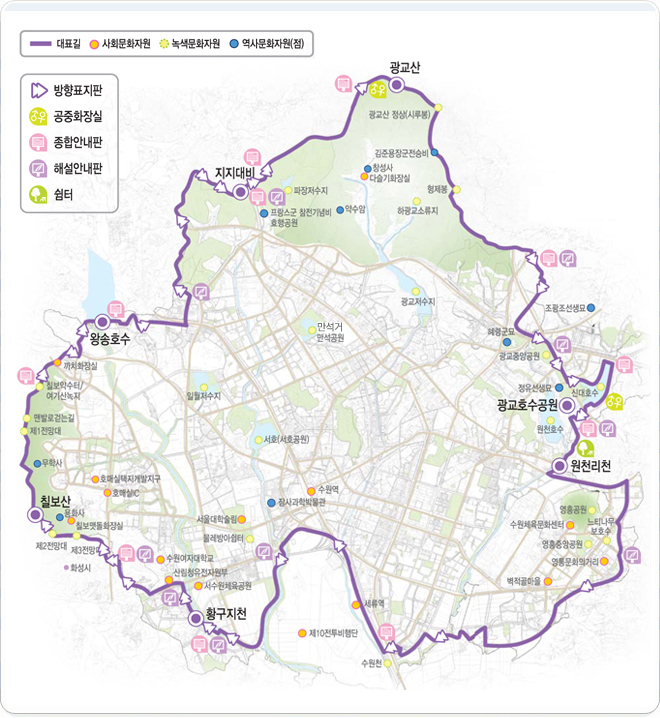 광교호수공원 → 영통가로수길 → 원천리천 → 황구지천 → 칠보산 → 왕송호수 → 밤밭청개구리공원 → 효행공원 → 광교산 → 광교호수공원