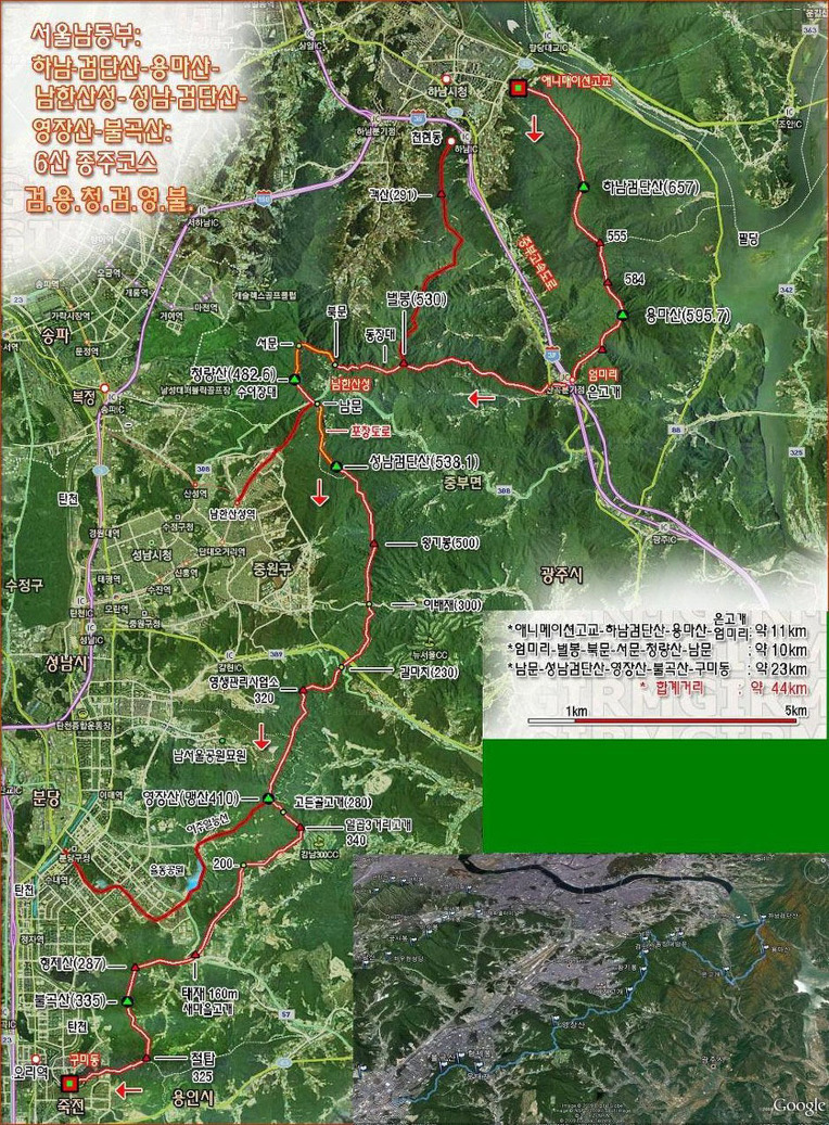 하남 애니메이션고 ~ 유길준묘 ~ 하남 검단산 ~ 고추봉(두리봉) ~ 용마산 ~ 희망봉 ~ 장작산 ~ 광지원리 ~ 노적산 ~ 약사산 ~ 약수산 ~ 한봉 ~ 남한산 ~ 벌봉 ~ 북문 ~ 연주봉 ~ 서문 ~ 청량산(수어장대) ~ 남문 ~ 남한산성 식당 ~ 검단산 ~망덕산 (왕기봉) ~ 이배재 ~ 요골산 ~ 갈마치 ~ 고불산 ~ 중원터널 ~ 영장산 ~ 태재 ~ 불곡산 ~ 구미초교 ~ 오리역
