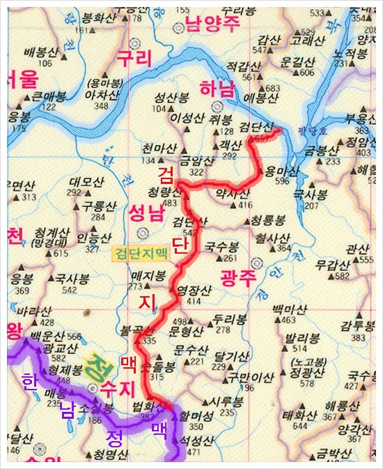 하남 애니메이션고 ~ 유길준묘 ~ 하남 검단산 ~ 고추봉(두리봉) ~ 용마산 ~ 희망봉 ~ 장작산 ~ 광지원리 ~ 노적산 ~ 약사산 ~ 약수산 ~ 한봉 ~ 남한산 ~ 벌봉 ~ 북문 ~ 연주봉 ~ 서문 ~ 청량산(수어장대) ~ 남문 ~ 남한산성 식당 ~ 검단산 ~망덕산 (왕기봉) ~ 이배재 ~ 요골산 ~ 갈마치 ~ 고불산 ~ 중원터널 ~ 영장산 ~ 태재 ~ 불곡산 ~ 구미초교 ~ 오리역