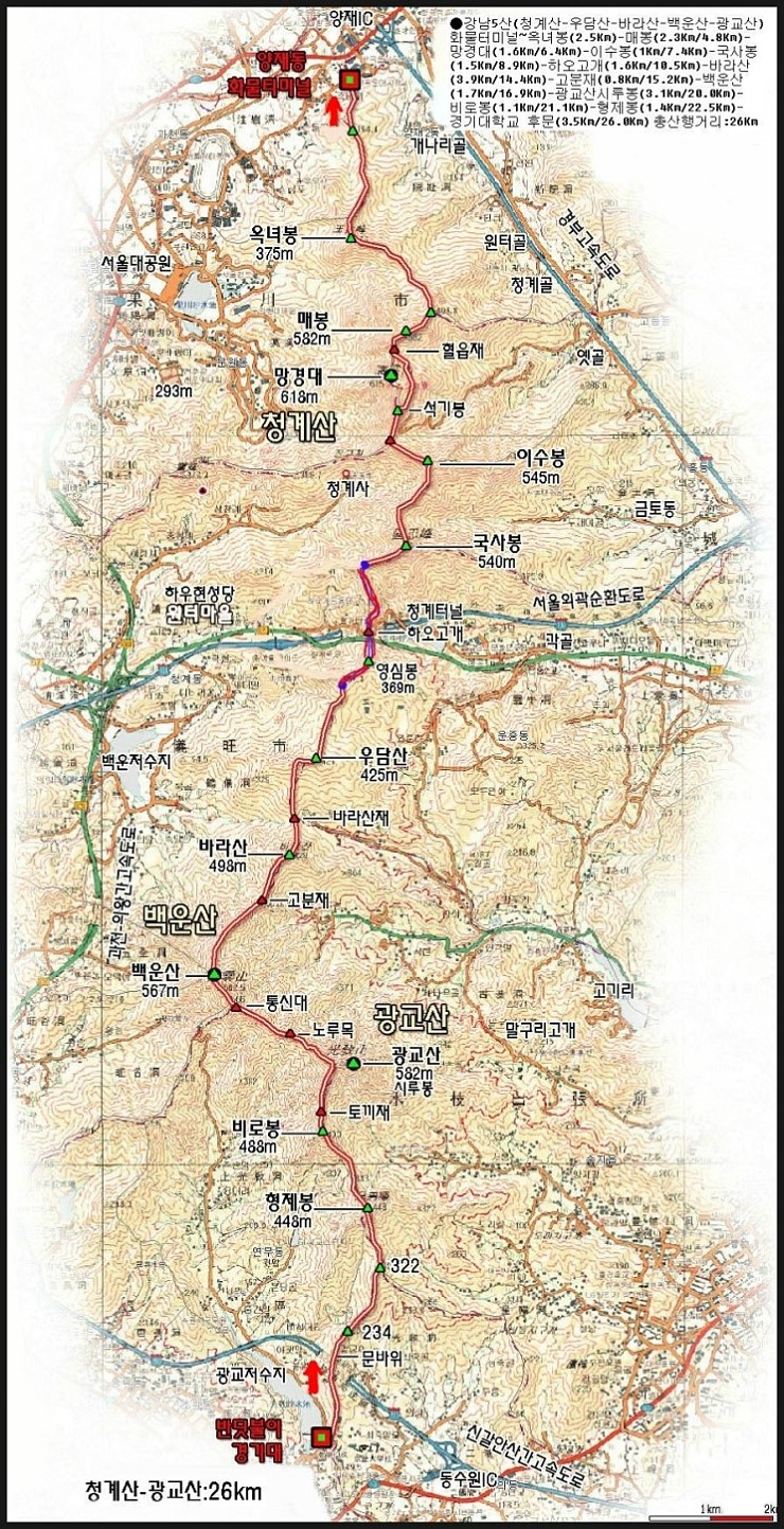 강남 5산(광교산, 백운산, 바라산, 우담산, 청계산)을 종주하는 것으로 거리는 약 24km 정도 된다.