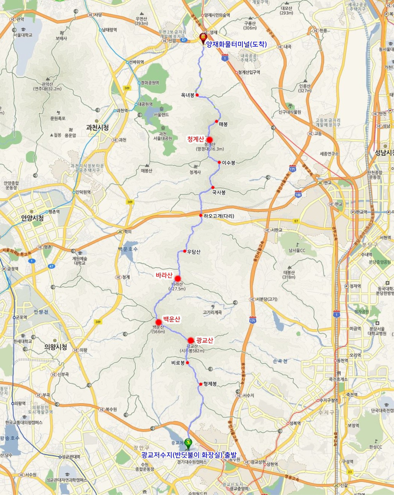 억새밭에서 백운산-바라산-우담산-영신봉-하오고개-국사봉-이수봉-석기봉-망경대-매봉-옥녀봉-굴바위산- 양재화물터미널까지다.