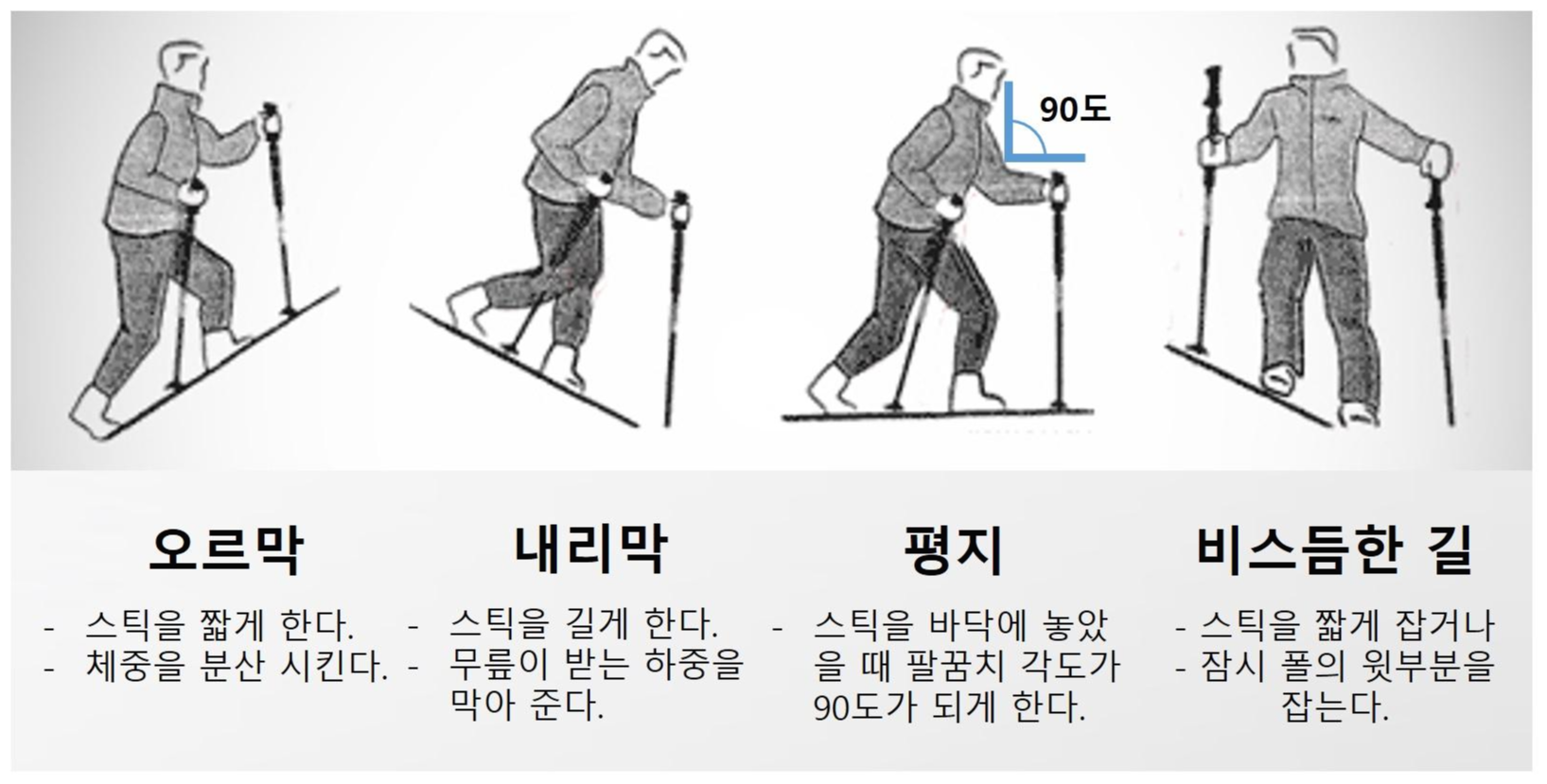 하산 시에는 앞으로 기울이지 않고, 몸의 중심을 뒤로 잡으면서 내려가는 것이 좋습니다. 또한 발을 내딛을 때 발끝부터 착지하는 것이 아니라 발바닥 전체로 땅에 닿게 하는 것이 중요합니다.